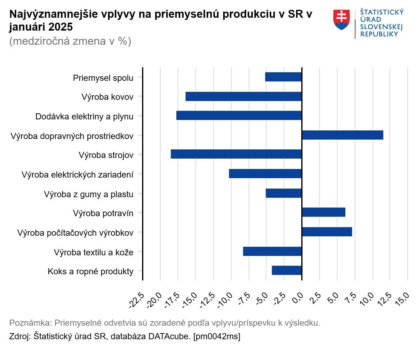 "Priemyselná produkcia SR v januári 2025 medziročne klesla o 5,2 percenta, čím sa po pol roka trvajúcom raste dostala opäť do mínusu. Pokles výkonu bol najvýraznejší od marca 2024. Aj na začiatku roka sa vysoké rasty v kľúčových odvetviach vykrývali výraznými prepadmi v iných, tiež podstatných štruktúrach priemyslu.