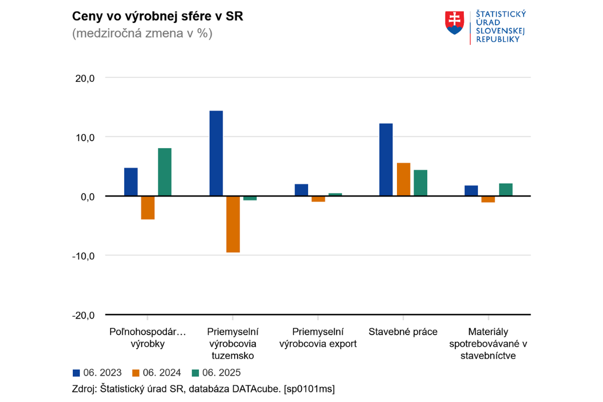 Ceny priemyselných výrobcov pre tuzemský trh boli v júni 2025 medziročne nižšie o takmer jedno percento. V súhrne za šesť mesiacov roka 2025 boli tuzemské výrobné ceny v priemysle vyššie o 0,5 percenta, v medzimesačnom porovnaní vzrástli o 0,4 percenta.