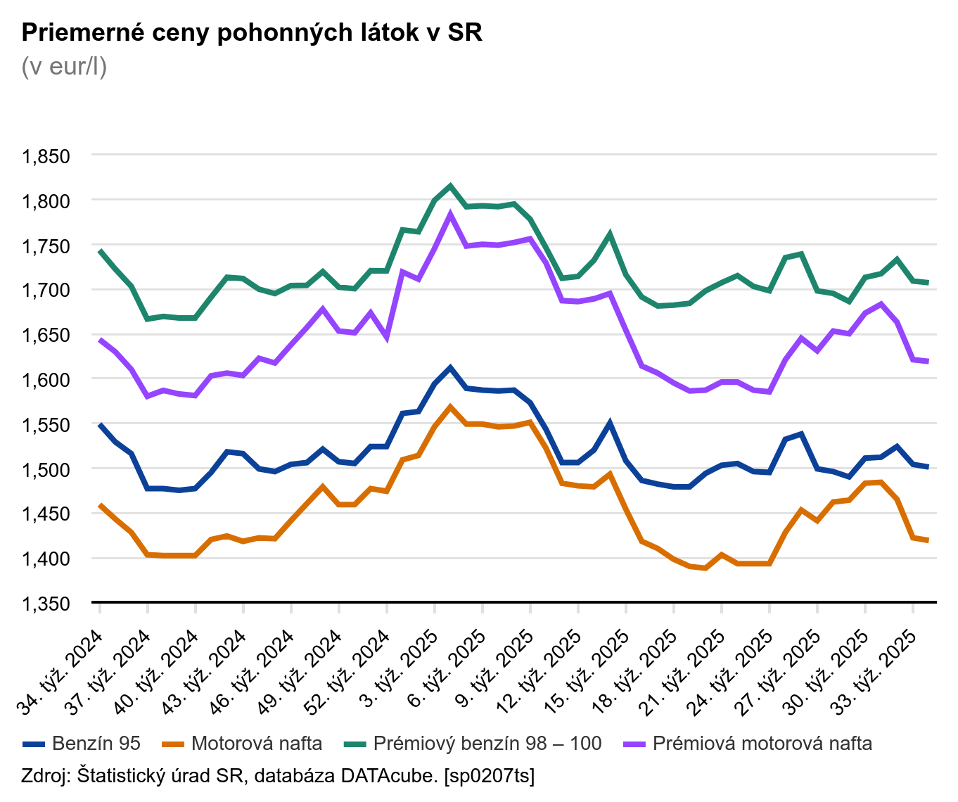Spotrebiteľské ceny sledovaných druhov pohonných látok počas 34. týždňa nepatrne klesli. Benzíny sa v druhej polovici augusta predávali za najnižšie ceny za posledných päť týždňov, klesli druhý týždeň. Motorová nafta zlacňovala posledné tri týždne, jej cena bola najnižšia za posledných desať týždňov. Informoval o tom Štatistický úrad.