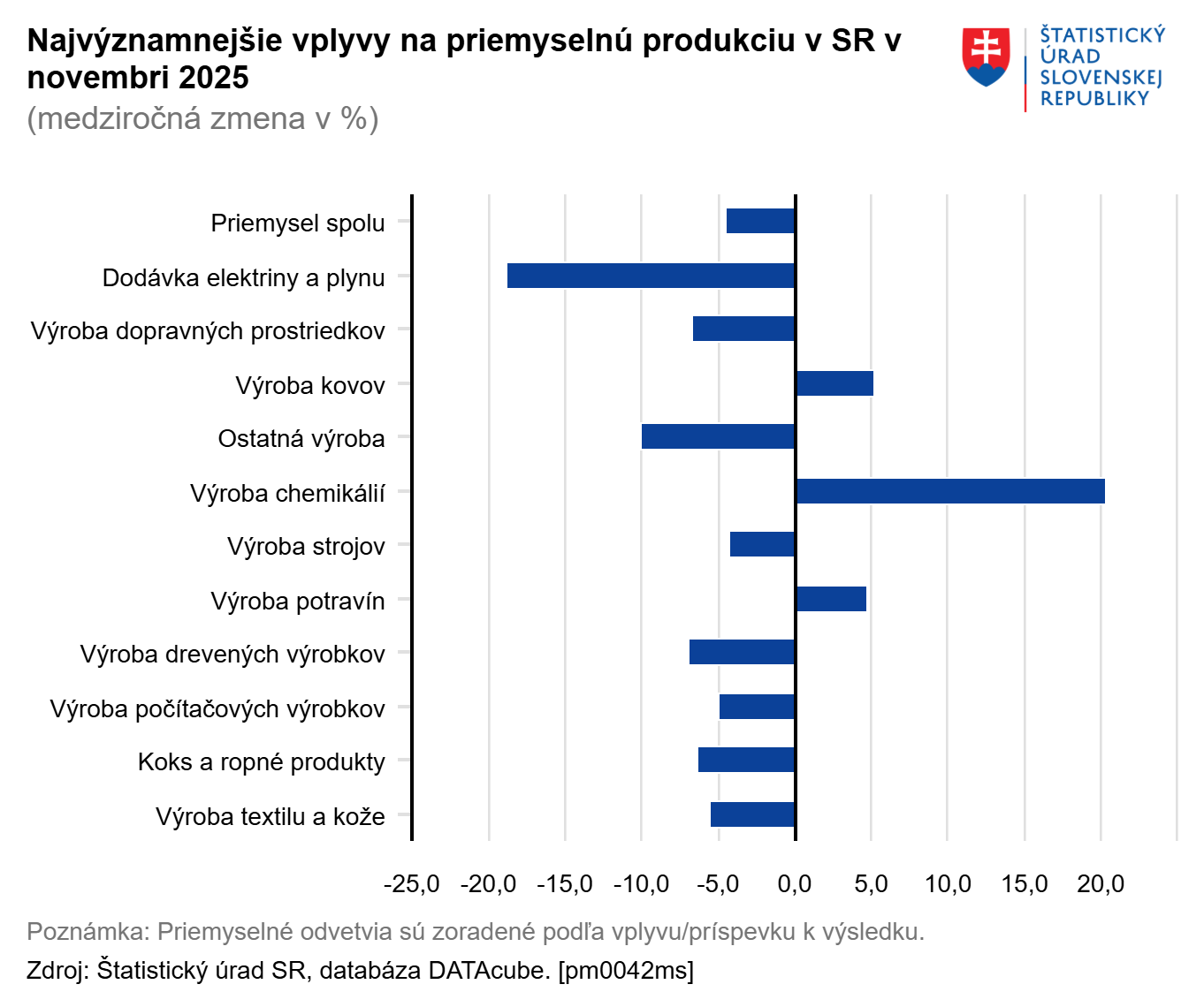Ani viac ako 20-percentný nárast vo výrobe chemikálií, ktorý mal piaty najväčší vplyv, nedokázal zmierniť výrazný pokles priemyselnej produkcie. Po zohľadnení sezónnych vplyvov sa medzimesačne (oproti októbru 2025) priemyselná produkcia zvýšila o 0,9 percenta.