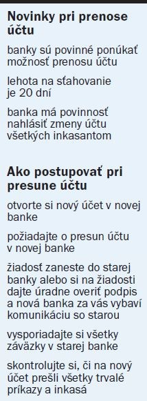 Novela stanovuje maximálnu lehotu prenosu účtu z banky do banky na dvadsať dní. „Klient si môže stanoviť aj neskorší termín presunu, aby všetci jeho platitelia aj inkasné spoločnosti mali dostatok času na zmenu jeho čísla účtu vo svojich databázach,“ dodáva Zuzana Eliášová, hovorkyňa ČSOB....