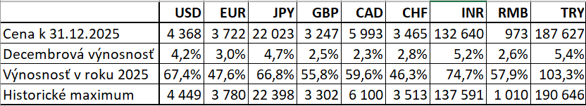 Zlato bolo vlani investične mimoriadne lukratívnou komoditou. Tesne pred Vianocami dosiahlo svoje 53. historické maximum v roku 2025 na úrovni 4 449 dolárov za trójsku uncu a rok uzavrelo na hodnote 4 368 dolárov za uncu.
