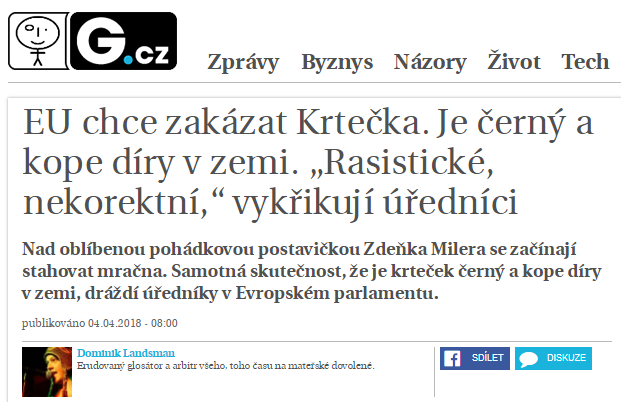 Jen co pominulo aprílové šílenství, konzumenti internetových zpráv zase ztratili obezřetnost. Je zkrátka potřeba smířit se s faktem, že jediným dnem, kdy si lidé bedlivě ověřují informace, je právě první duben. A tak není divu, že středeční článek o Krtečkovi z dílny recesistického webu G.cz vzali někteří lidé smrtelně vážně - rozdrnkal totiž spodní strunu lidských srdcí o korektnosti a zlé zlé ošklivé EU.