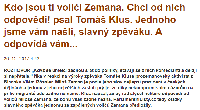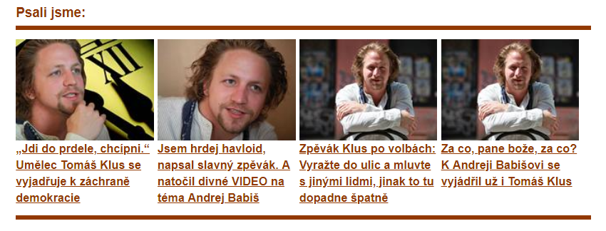 Ale není to jen jeden článek, Tomáš Klus leží Parlamentním listům v žaludku dlouhodobě, z prvního článku na obrázku to může snadno působit, že zpěvák je hrubián a poslal kohosi kamsi ve jménu demokracie, ale není tomu tak. Ještěže více než titulek si většina čtenářů stejně nepřečte.