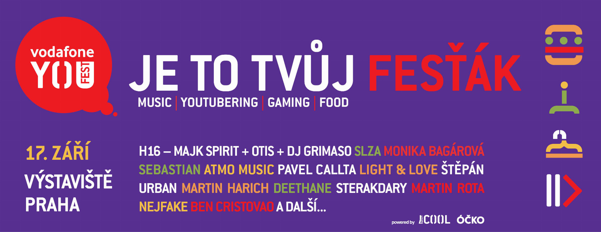 "Spojení hudby, youtuberingu, gamingu, lifestylu a fresh food festivalu pod jednou střechou Průmyslového paláce v Praze. To je babí léto na Vodafone YOU FEST, který již 17. září přinese Prima COOL a ÓČKO," uvedla v dnešní tiskové zprávě Nicol Klevcovová z TV Prima