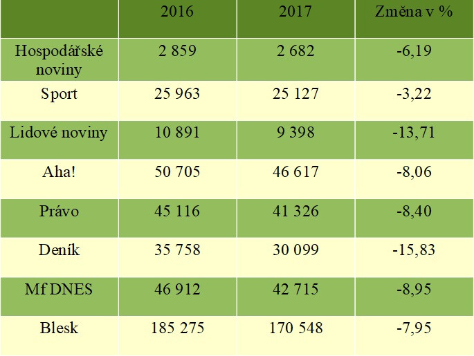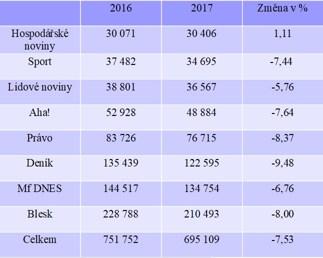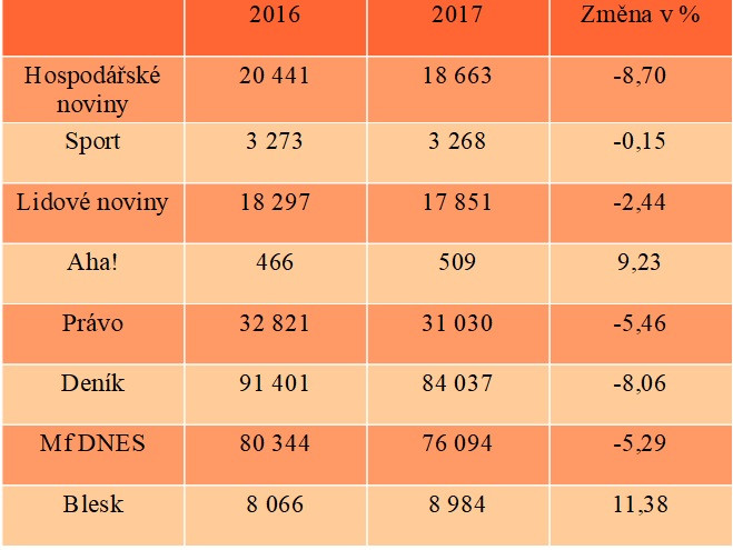 Propad prodejů českého tisku pokračuje. V celkových číslech si polepšily pouze Hospodářské noviny. Ty ovšem zachraňují ostatní a elektronické prodeje. Jinak jim, stejně jako ostatním, klesá prodej na pultech i předplatné. Druhá nejlepší celková čísla pak mají Lidové noviny. Nejhůř si naopak meziročně vedl Deník. V pultovém prodeji ztratil skoro 16 procent. V předplatném se pak daří bulváru. Jeho předplatné ovšem vychází z velmi malých čísel, která není až tak složité navyšovat.