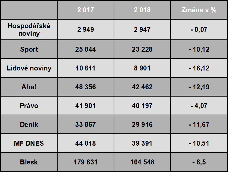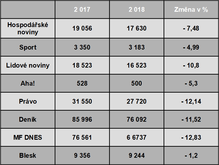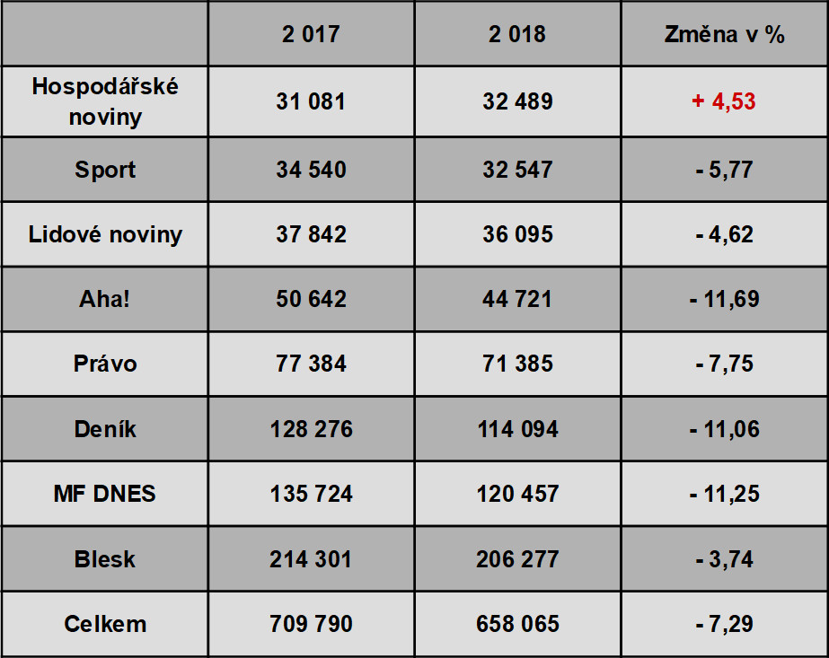 Celkem se dařilo i Lidovým novinám (MAFRA), které zaznamenaly meziroční pokles o 4,62 procenta.