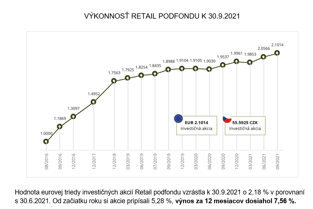 Neplatí to len v prípade Office podfondu, orientovaného na bratislavské a pražské administratívne budovy, ale aj pri Retail podfonde, ktorý zastrešuje pražské nákupné centrá Galerie Harfa a Centrum Krakov. Zatiaľ čo v prípade prvého fondu krivka výkonnosti rástla nepretržite aj počas období sprevádzaných lockdownami a prechodom nájomcov na čiastočný homeoffice, v prípade Retail podfondu sa ukazuje rýchly návrat do rastového trendu (od júna 2020 a marca 2021) hneď po uvoľnení opatrení.