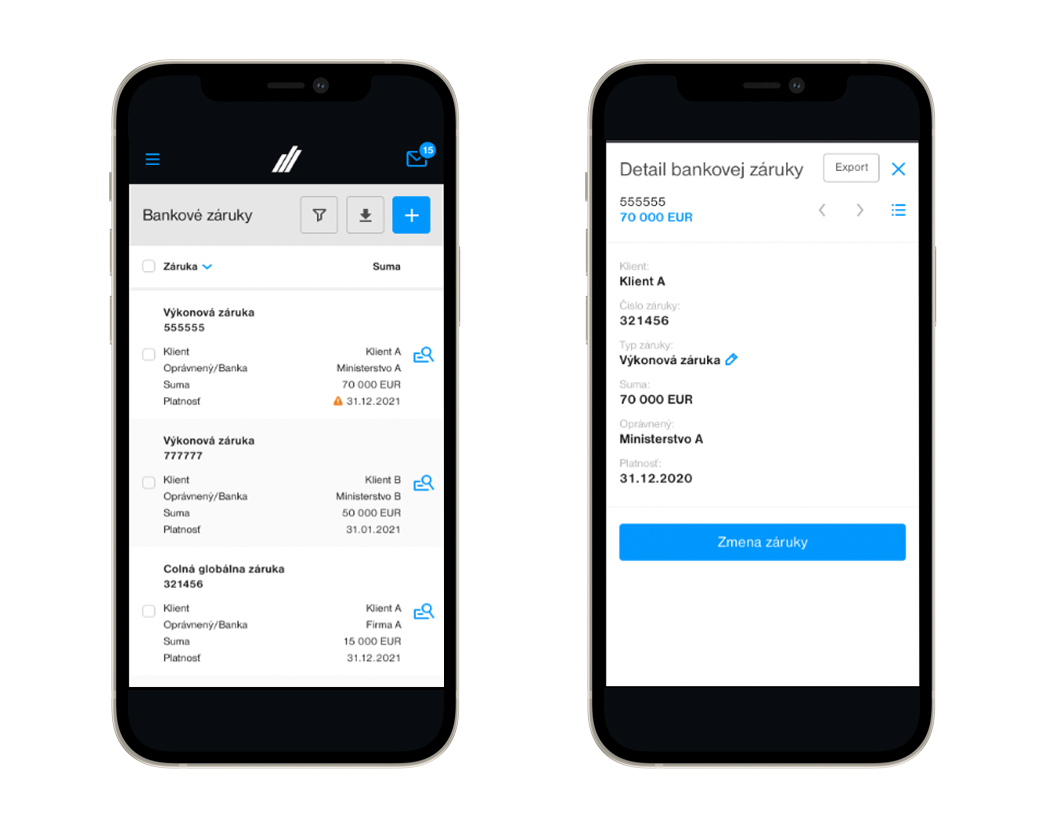 Zároveň aplikácia ponúka detailný prehľad o všetkých vystavených bankových zárukách vrátane ich výšky, oprávnenej osoby a termínov platnosti. Na blížiacu sa exspiráciu ktorejkoľvek záruky systém automaticky upozorní.