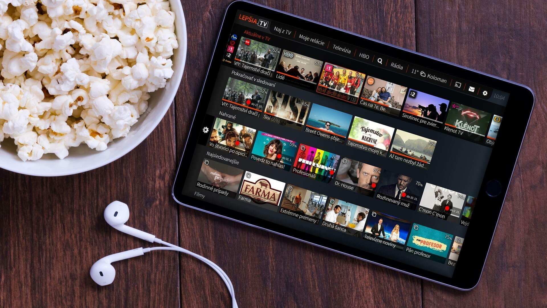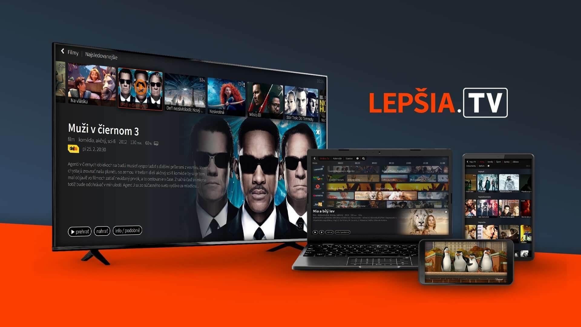 Lepšia.TV Vám umožní sledovať Vaše obľúbené filmy a seriály nielen v televízii, ale tiež v počítači, notebooku, tablete alebo Vašom chytrom telefóne. Ale hlavne sa môžete pozerať všade tam, kde máte dostupný internet. Na záhrade, pod pergolou, na chalupe alebo pri cestovaní po EU.