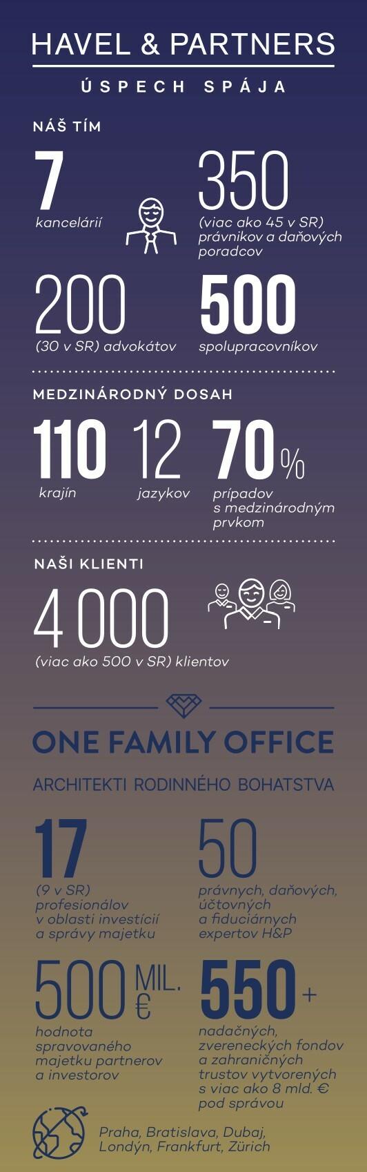 Ochrana rodinného majetku je pre úspešné podnikateľské rodiny kľúčovou prioritou. Advokátska kancelária HAVEL & PARTNERS v úzkej spolupráci s ONE FAMILY OFFICE, najväčšou rodinnou kanceláriou v strednej Európe, prináša unikátne riešenia, ktoré kombinujú právnu, daňovú a investičnú expertízu. ONE FAMILY OFFICE má výrazný slovenský rozmer -takmer polovica zo 17-členného seniorného tímu tvoria poprední slovenskí profesionáli pôsobiaci v Bratislave, Prahe a Dubaji, vrátane Michala Kľučára, Štěpána Štarhu, Michala Magica, Jany Holíkovej, Miroslava Dobšoviča, Jakuba Vrbovského a Petra Bálinta. Celkovo hodnota spravovaného majetku partnerov a investorov ONE FAMILY OFFICE presahuje 500 miliónov eur.