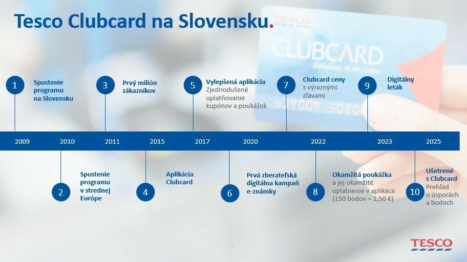 Keď Tesco v roku 2010 naplno spustilo svoj vernostný program Clubcard v strednej Európe[1], išlo o jeden z prvých komplexných lojalitných systémov v slovenskom maloobchode. Do dvoch rokov od spustenia počet členov Clubcard na Slovensku prekročil milión. Spočiatku zákazníci dostávali vyúčtovanie so zľavovými kupónmi každý štvrťrok poštou v obálke. Tesco Clubcard sa rýchlo etabloval ako priekopnícka iniciatíva s masovým dosahom, ktorá významne ovplyvnila vývoj maloobchodného trhu.