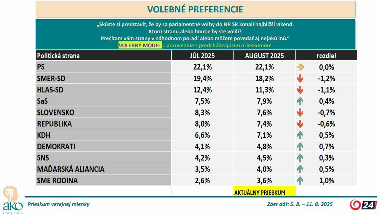 Druhý augustový prieskum ukazuje zväčšenie rozdielu medzi Progresívnym Slovenskom a vládnym Smerom-SD. Zatiaľ čo strana Michala Šimečku si udržala preferencie z júla, Smer za mesiac mierne klesol.