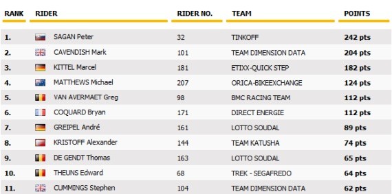 Priebežné poradie v boji o zelený dres po 10. etape: