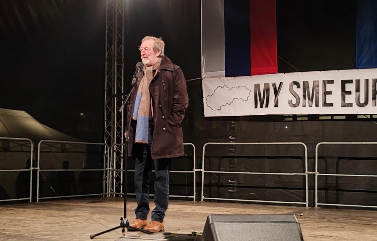 “Oni si nevedia predstaviť, že niekto sa zaujíma o veci verejne, aj keď z toho nemá osobný prospech. Oni nevedia, že to ľudia nerobia pre guláš a karafiát,” rečnil herec. Tvrdí, že sme si už pred rokmi vybrali, kde chceme patriť. Dav ho podporil potleskom.