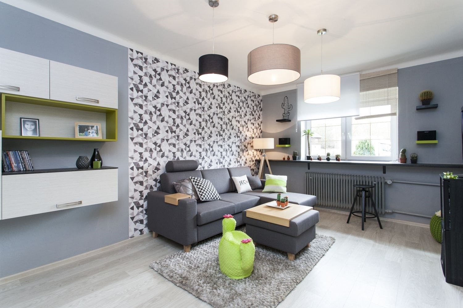 Pokiaľ ide o farby, s čiernou, po ktorej túžili deti, dizajnéri skôr šetrili. Prednosť dostali sivá a antracitová. Aj to v osviežujúcej kombinácii so zelenou a bielou. Čelné plochy dvierok majú svetlý drevený dizajn, podobne ako vinylová podlaha a nové dvere. „Bola to skutočne tvrdá práca. Nakoniec nám pomohla majiteľova láska ku kaktusom. Práve tá dala premene finálny a zjednocujúci smer, náplň, ale aj vtip,“ opisujú svoje počiatočné zápolenie s rekonštrukciou Kamila Douděrová a František Kobližka