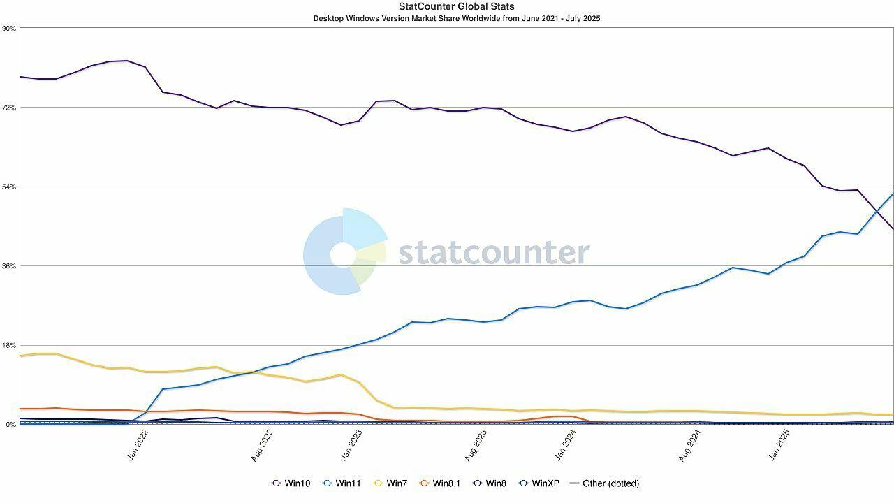 Podľa údajov Statcounteru Windows 11 konečne predbehol svojho predchodcu tento rok v júli. Skoro štyri roky je tak vlastne rekordné obdobie na prekonanie predchádzajúcej verzie Windowsu. Graf Statcounteru ukazuje, že 52 percent globálnych používateľov systému od Microsoftu teraz používa Windows 11 a 44,59 percenta používa jeho predchodcu.