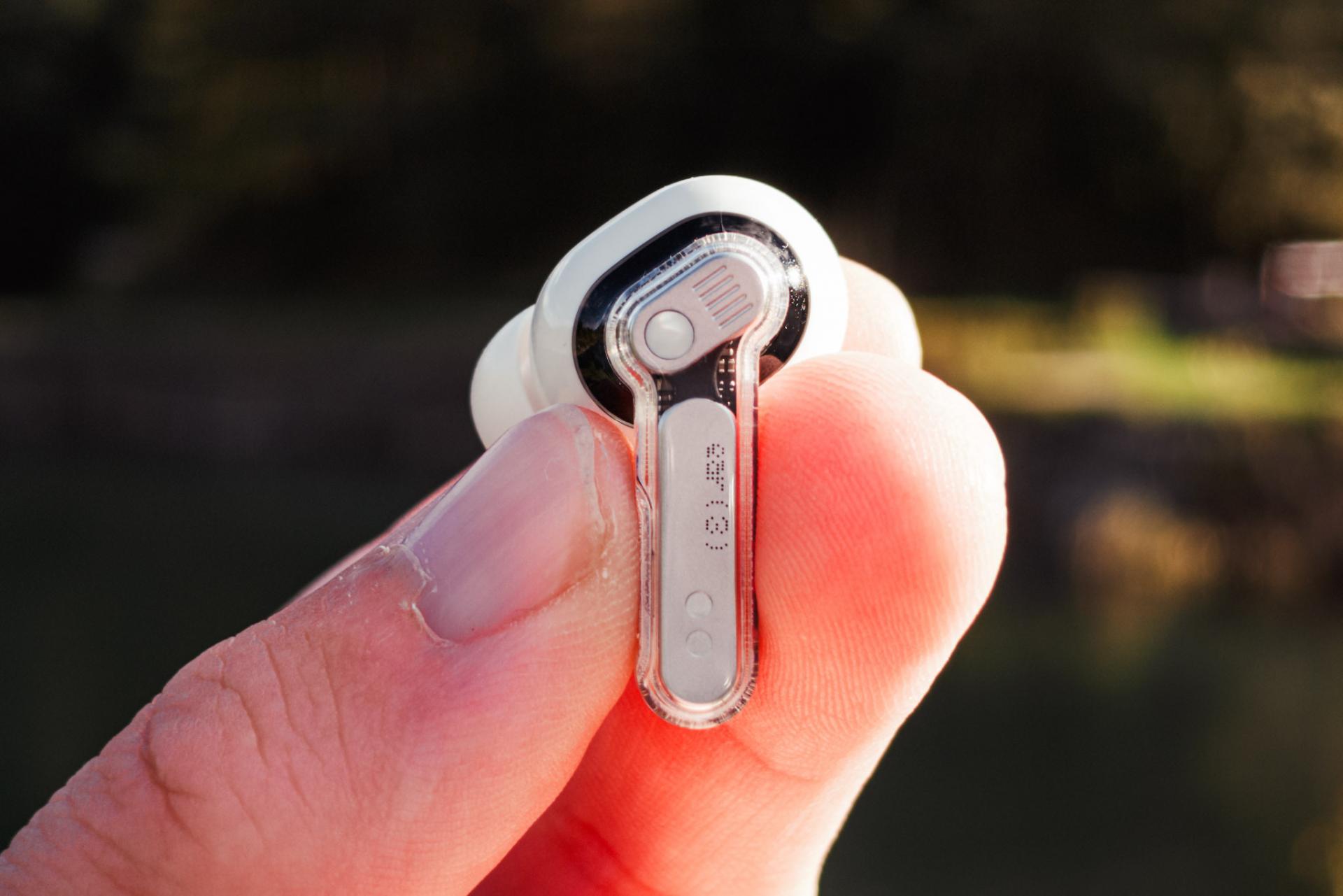 Priehľadný bok stonky odhaľuje ďalšie elektronické prvky, pričom tu vidíme aj dotykovú plochu, ktorá ale nereagovala úplne ideálne a úspešní sme boli pri niektorých pokynoch iba v polovici prípadov. Naopak, pozastavenie hudby či ovládanie potlačenia ruchov fungovalo prakticky bezchybne. Z vnútornej strany stonky vidíme ešte nabíjacie piny a pri jej napojení na hlavnú časť slúchadla sa nachádza ešte mikrofón.