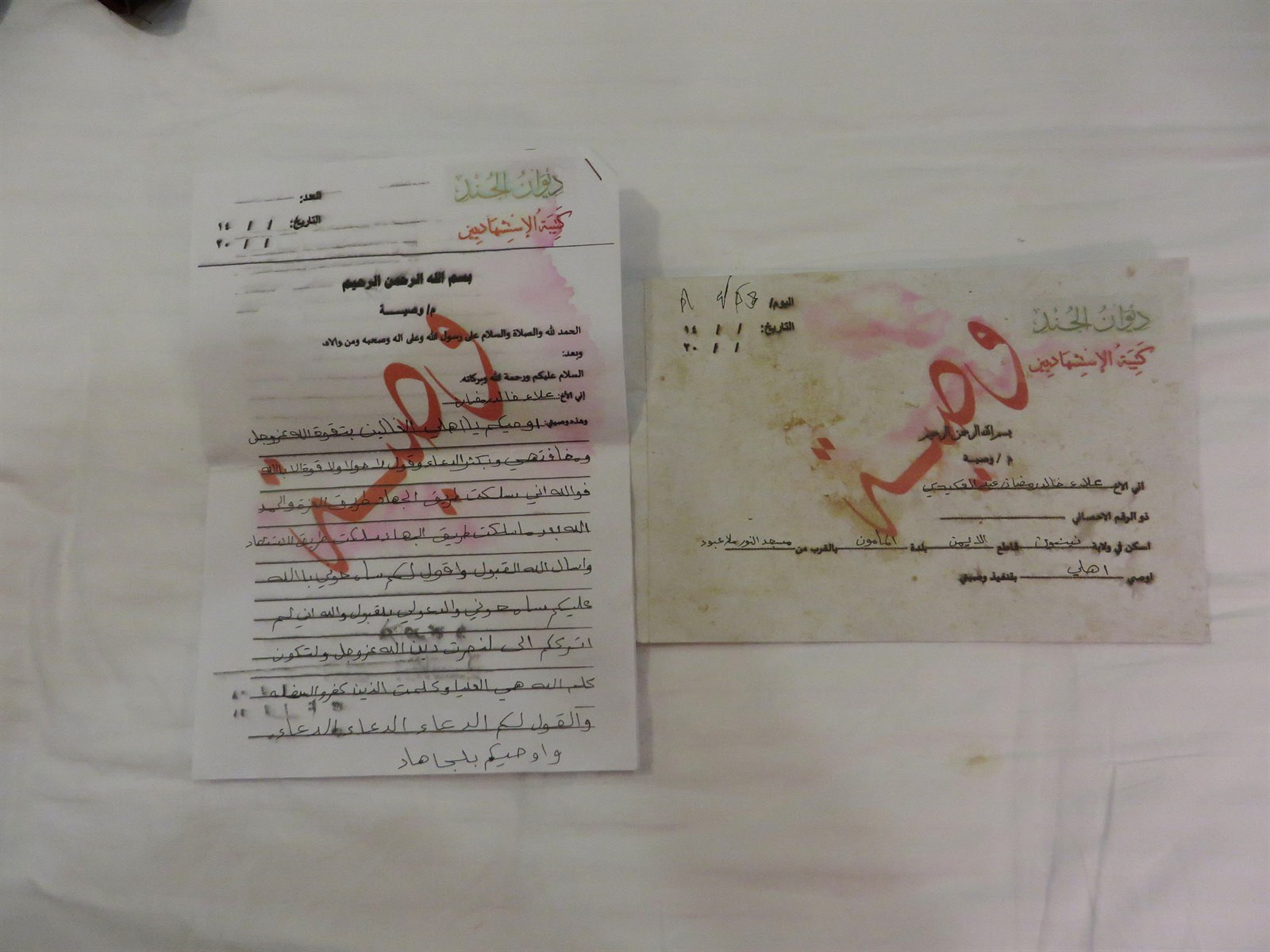 Alá Abd al-Akédí list nikdy neodoslal. Text vo forme formuláru Islamského štátu bol však zrejme adresovaný jeho rodine v západnom Mosule. Zostal zabudnutý spolu so stovkami ďalších dokumentov islamistov po ofenzíve irackých vojsk vo východnej časti mesta. Vojaci vo výcvikovom centre objavili aj zoznam s osobnými detailmi asi päťdesiatich "mučeníkov".