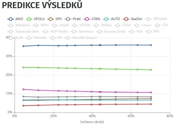 Portál iDNES.cz pripravil unikátny model predikcie výsledkov volieb do Poslaneckej snemovne v Česku. Môžete tak sledovať odhady na základe sčítaných okrskov s tým, že model zohľadňuje rozdiely v hlasovaní medzi veľkými mestami a menšími obcami a tiež počíta s tým, že najprv sú spočítané tie najmenšie okrsky. Upozorňujeme čitateľov, že kalkulácie sú priebežné na základe dostupných dát.