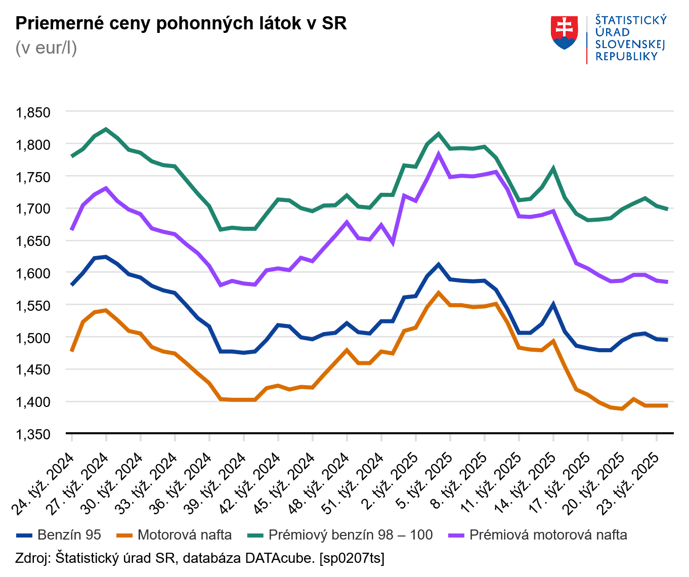 Ceny pohonných látok počas 24. týždňa klesli iba veľmi mierne. Benzín 95 sa predával za najnižšiu cenu za štyri týždne, priemerná cena prémiových benzínov bola najnižšia od septembra 2024.