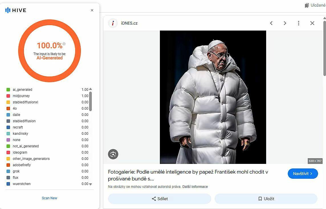 Pri obrázkoch síce možno skúmať popis, štítky alebo vodoznaky, prípadne hľadať typické chyby AI, ako sú neprirodzené textúry, skreslené detaily či nesúlad v detailoch. Všetky tieto metódy sú však manuálne a žiadna sa nevyrovná pohodliu, ktoré ponúka špecializovaný nástroj na detekciu AI. Aj Hive AI Detector určený pre Chrome, ale napríklad aj Edge využíva pokročilé modely strojového učenia na identifikáciu rôznych typov obsahu generovaného umelou inteligenciou, vrátane obrázkov.